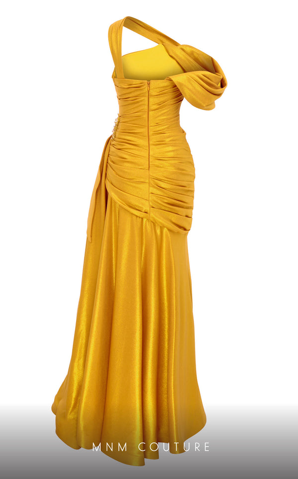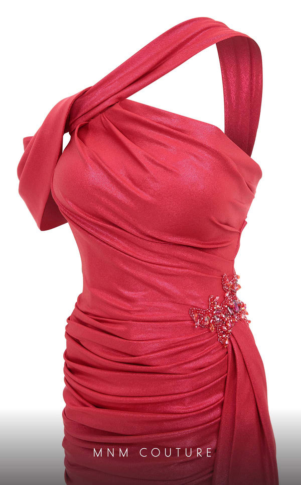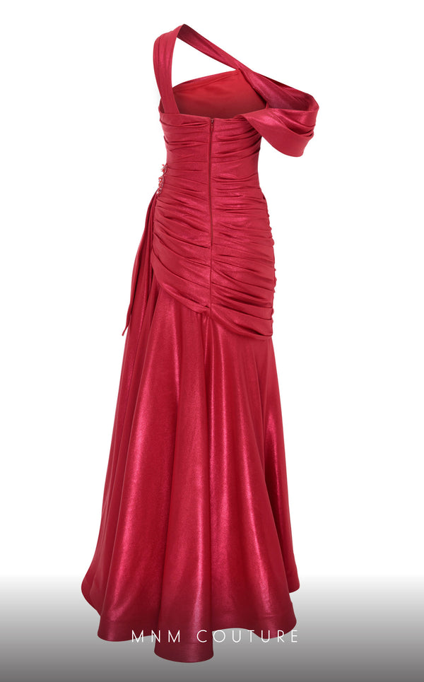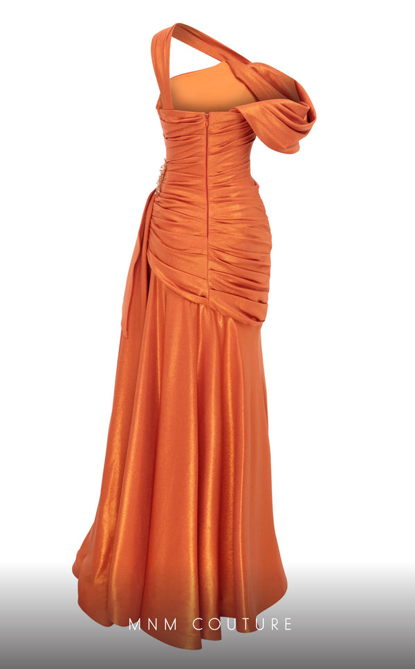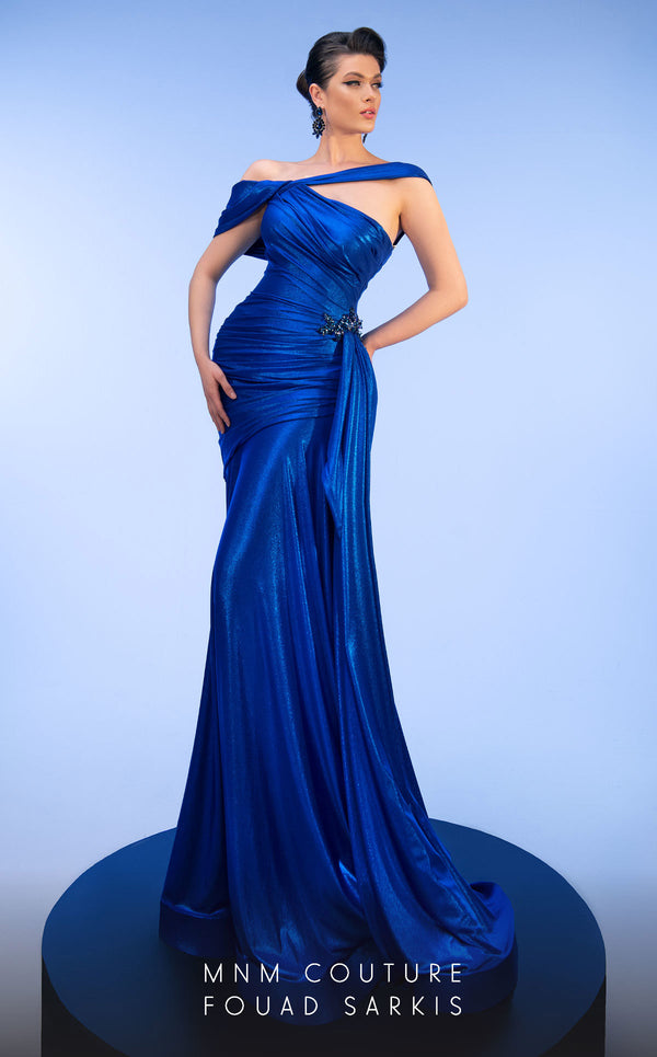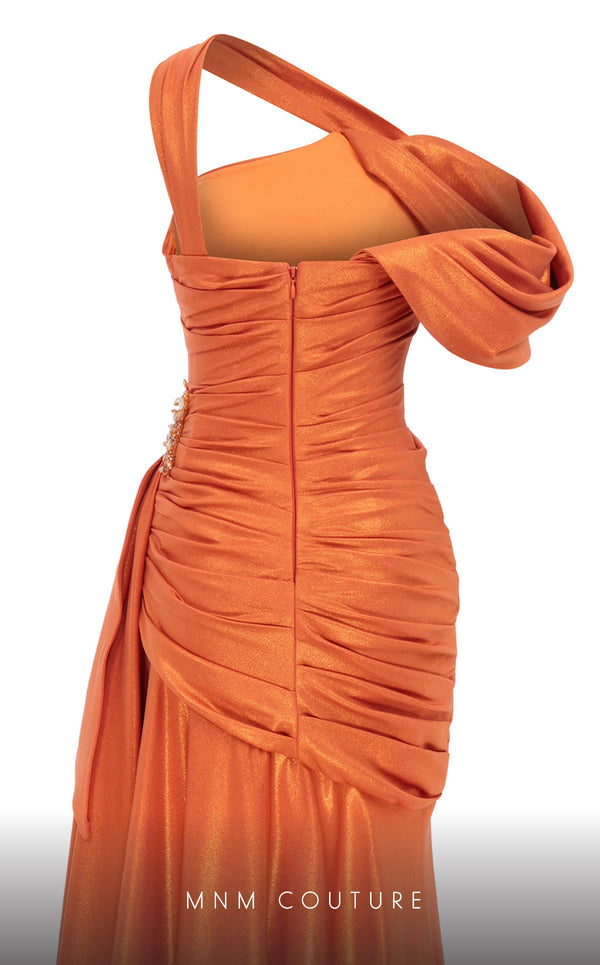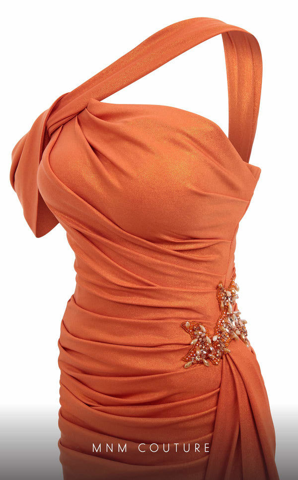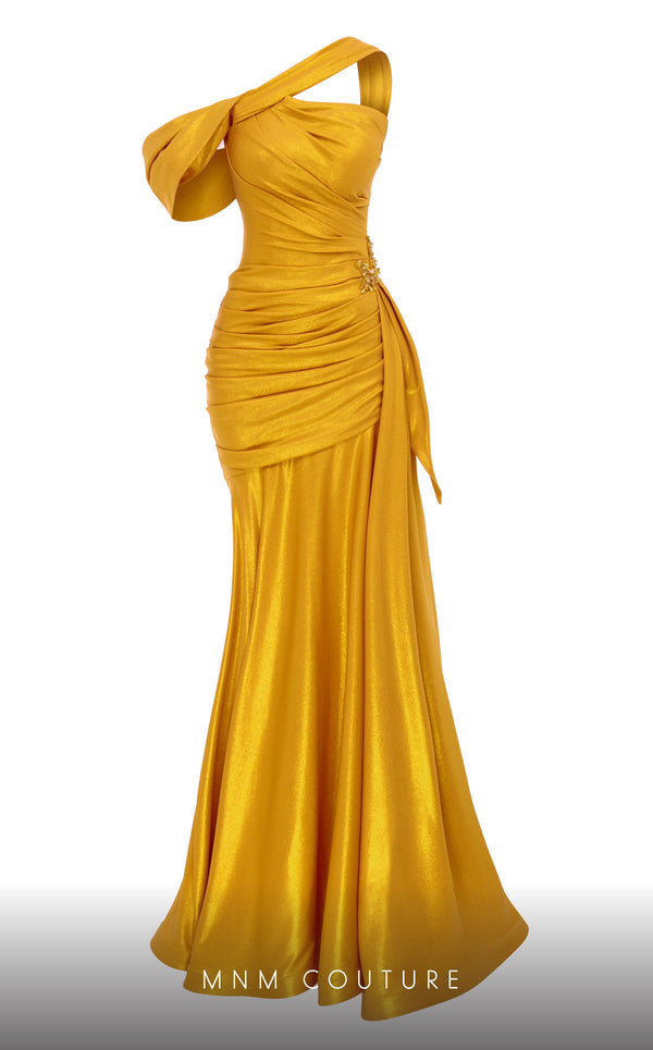 Step into a world where luxury and sophistication coalesce with the MNM Couture 2792, a masterpiece designed for the discerning woman who commands attention and adorns herself in confidence. With its metallic laminated crepe fabric that glistens under the evening lights, this gown is the embodiment of elegance – exclusivity made tangible.With a deliberate asymmetrical upper neck cut and a single off-shouldered sleeve, the MNM Couture 2792 contours the body with its mermaid cut, celebrating the silhouette. The fully draped design cascades into a graceful tail, punctuated by an adornment of sparkling embellishments on the waist, culminating in a statement piece that thrives in both grandeur and grace. Bask in the undeniable presence this gown commands, and embody the essence of couture at every turn.Find yourself entranced by the fit-the-body design, a testament to haute couture craftsmanship, and allow the MNM Couture 2792 to transcend mere fashion. Keywords such as 'Metallic Evening Gown', 'Mermaid Cut Luxury Dress', 'Sophisticated Event Wear', resonate with the piece, elevating the haute couture conversation.Due to the gown's exclusive nature and limited quantity, your window to acquire this exemplar of Couture Shop LA's commitment to luxury and inclusivity is momentary. Ensure immediate action—whether you are here in LA or browsing online, the MNM Couture 2792 is available for worldwide shipping, offering an unparalleled purchasing experience. Visit us in-store for a personalized touch, or secure your gown today at Couture Shop LA.