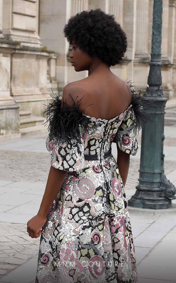 Step into elegance with the MNM Couture K4058 from Couture Shop LA. This stunning mesh and embroidered dress features a back hidden zipper, long off-shoulder ruffle sleeves, and a straight-across natural ball gown silhouette. Embellished with sequins and beads throughout, it includes a chic belt at the waistline, making it a perfect choice for any formal event.
