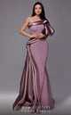 Elevate your elegance with MNM Couture K3932, an asymmetric A-line gown featuring a statement one-shoulder silhouette with a split cape sleeve. Its corset bodice is adorned with intricate beading and sequins, complemented by a thin belt and sweeping full-length design. Perfect for gala-worthy sophistication.