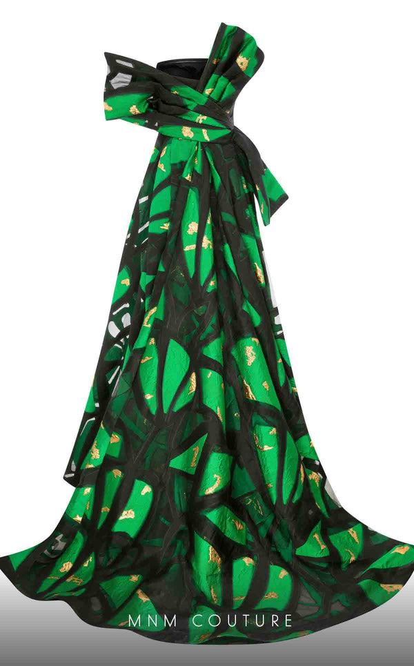 MNM Couture N0395 is a timeless choice with its strapless design and fitted bodice. The trumpet skirt flares gracefully, while the pleated back and elegant train exude a classic sophistication.