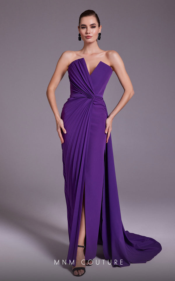 MNM Couture N0532 exudes sophistication with its strapless crepe design. The gown features a flattering plunged neckline, pleated details, and a twist bodice. An overskirt with a train completes this elegant masterpiece.