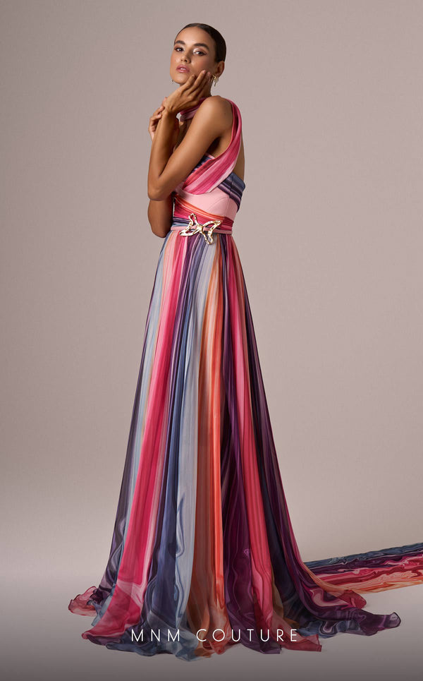 Turn heads with MNM Couture E0080, a vibrant multi-colored chiffon masterpiece. This sleeveless gown boasts a flared silhouette, straight neckline, and a striking brooch accentuating the waistline, accompanied by a flowy scarf for added charm.