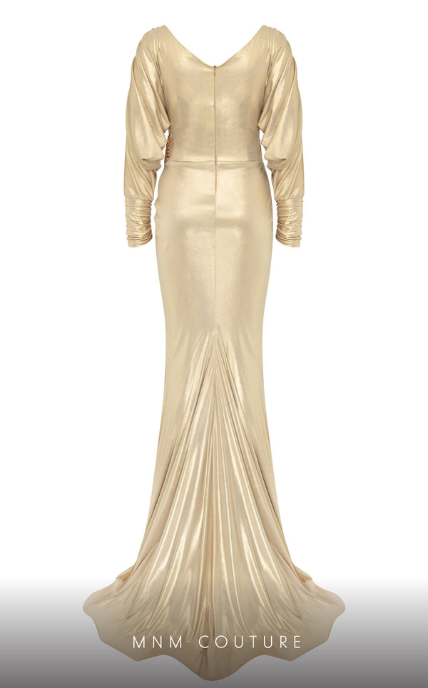 Step into sophistication with the MNM Couture 2756, crafted from Jersey lameh. Featuring a V-neck and Mermaid silhouette with puffed sleeves, this gown is adorned with embroidery on the waist and superpositioned corsets, perfect for those who desire refined elegance.