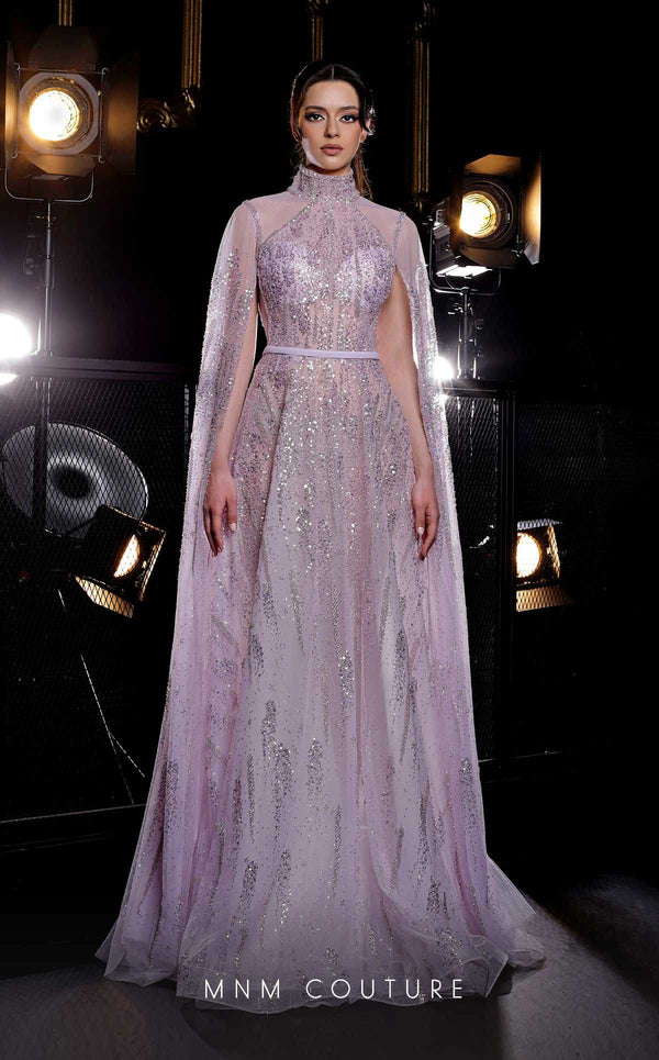 Exude grandeur with the MNM Couture K3975, a silver and purple A-line gown that redefines elegance. This gown features luxurious cape sleeves, a high neckline, and translucent shoulders. Intricate embroidery with sequins and beads adds a dazzling touch, complemented by a fabric belt.