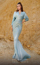 Make a statement in MNM Couture K4038, a dramatic mermaid gown with sheer long sleeves and a flowing cape. Intricately beaded details add depth and luxury, while its off-shoulder silhouette highlights timeless elegance.
