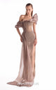 Embrace architectural beauty with MNM Couture Style G2106. We designed this sculptural brown off-shoulder gown to combine fluid organza accents sweeping elegantly across smooth crepe. The dramatic cloud-like volumes at the shoulder and hip create a stunning visual balance. Featuring a sleek high slit, this gown delivers the perfect mix of structure and softness.