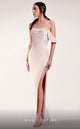 This stunning asymmetrical mermaid gown MNM Couture G1430 features pleated sleeves, a concealed back zipper, and a dramatic open back paired with a sweeping train. With its plain yet striking design, it is perfect for a bold, fashion-forward appearance.