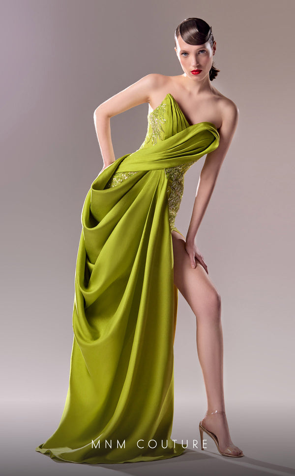 Unveil your inner radiance in the MNM Couture G1630 from Couture Shop LA. This breathtaking lime Strapless Draped Piqué and Lace Dress redefines elegance with its lustrous Piqué Mikado and delicate lace details. Be the center of attention—shop now!