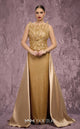 The MNM Couture Style J03595 is a stunning column gown featuring a crescent neckline adorned with glimmering crystal embellishments. The Olivia corset top creates a striking silhouette, while the shimmering beadwork trails along the entirety of the floor-length column skirt, making it perfect for red-carpet events.