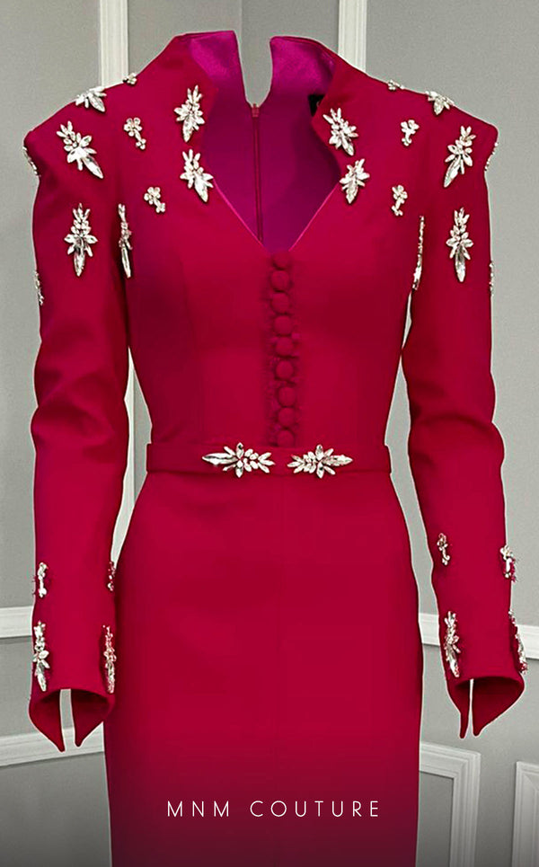Discover sophistication with the MNM Couture V02030, available at Couture Shop LA. This Rayon Crepe masterpiece showcases slashed long sleeves and a graceful V-neck, enhancing its column line silhouette. Embellished with rhinestones, crystals on shoulders pads, hands cuffs and on the refined belt along with unique button details from the V-neck till waist,. This gown effortlessly combines elegance and modernity, ideal for those seeking timeless evening wear.