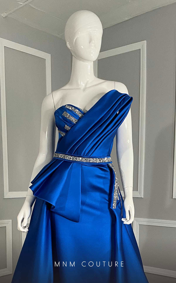 Feel the allure with the MNM Couture V07353 from Couture Shop LA. This luxurious Satin gown showcases a sleeveless asymmetric design with a column silhouette, complemented by an attached long train skirt. The intricate ruffle detailing and bead embellishments across the chest and waistline exude elegance, perfect for those desiring exclusive couture fashion.