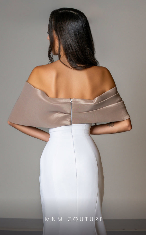 Indulge in luxury with the MNM Couture V07388, a standout in Exclusive Couture Dresses. This Rayon Crepe and Taffeta gown showcases cap sleeves and a straight-across neckline. The fitted mermaid silhouette with a long train is elegantly embellished with rhinestones in various shapes, offering a glamorous and sophisticated finish perfect for Luxury Evening Gowns Downtown LA.