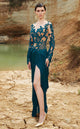 Showcase bold sophistication with the MNM Couture 2347. This trumpet gown in vibrant purple and red features an asymmetric one-shoulder strap adorned with delicate tassels. Intricate floral embroidery highlights the neckline and waist, cascading seamlessly into a dramatic flare skirt with a sweeping train.