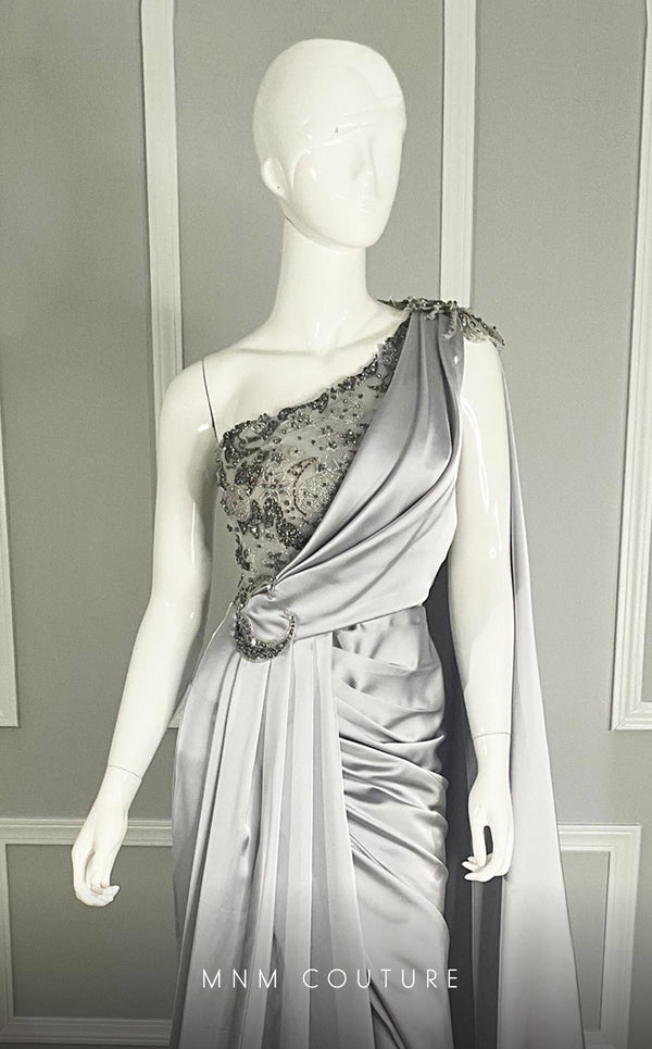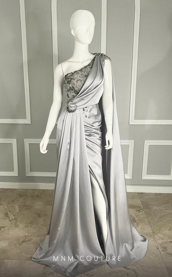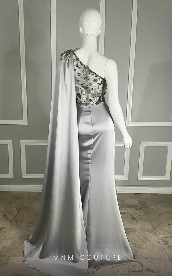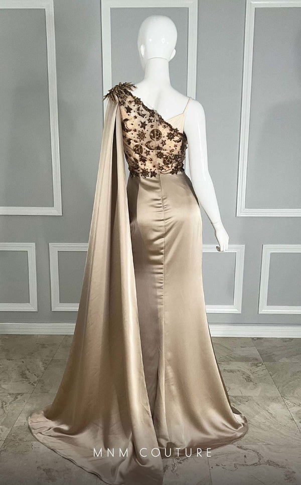 Embrace the charm of the MNM Couture M1108 Sati with Embroidered Mesh Dress from Couture Shop LA, a perfect blend of grace and style. This long dress is designed with a natural fit and a dramatic long train, featuring an asymmetric neckline embellished with delicate embroidery and beads. The one-side cape sleeve adds an elegant touch, making this dress ideal for any special occasion. Explore the world of bespoke fashion by visiting our shop today or shop online.