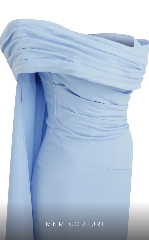 Achieve classic glamour with the MNM Couture 2718, a crepe mermaid gown designed for sophistication. This asymmetrical dress features a structured bodice that flows into exquisite draping details for a soft yet commanding silhouette. The sweep train adds to its graceful effect, making it the perfect choice for formal receptions, upscale galas, or evening soir�es.