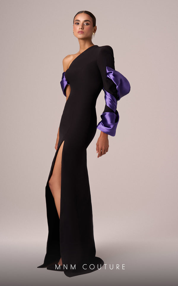 MNM Couture E0067 is a unique blend of crepe and metallic organza. The asymmetrical neckline is accented by a long ribboned sleeve and off-shoulder short sleeve, flowing into a Roman-inspired slit skirt.