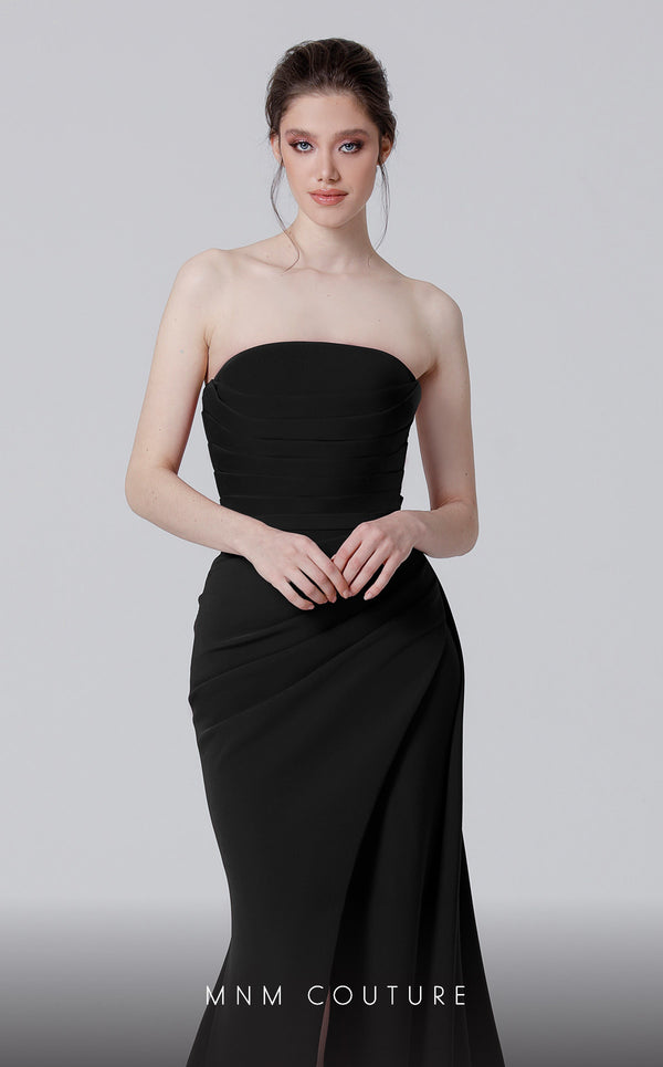 Embrace bold elegance with the MNM Couture N0464 from Couture Shop LA. This Fuchsia Crepe gown showcases a strapless, straight-across neckline and is tailored in a bodycon silhouette with a slit and tail. Draped embellishments on the bust and waist create a striking look, perfect for making a statement.
