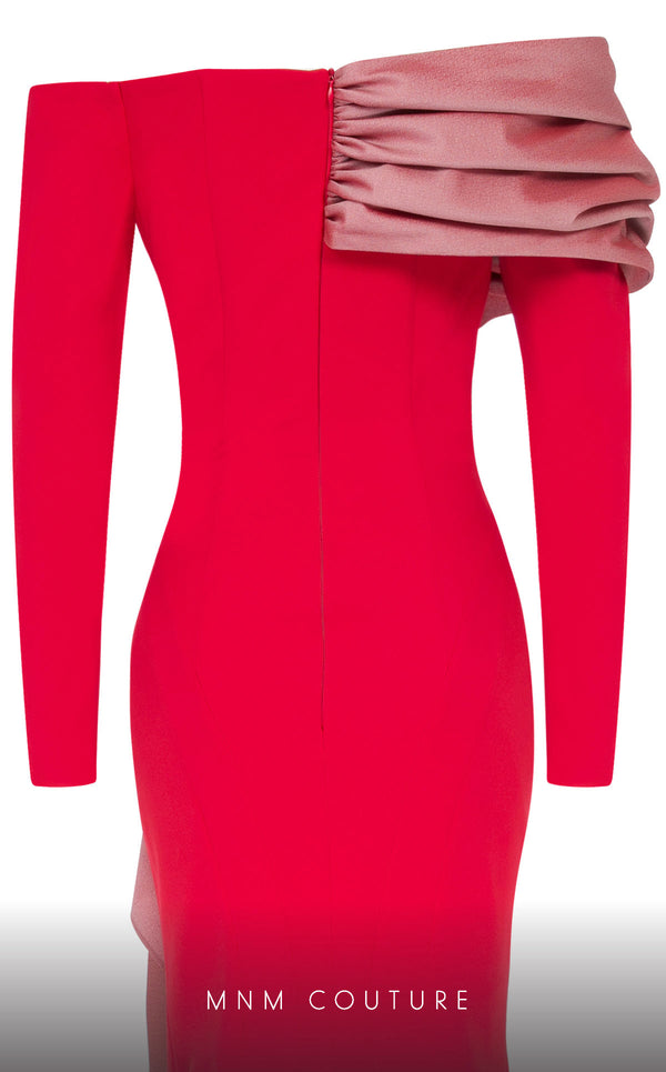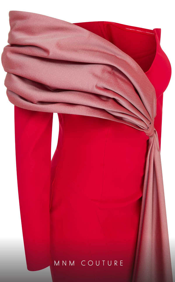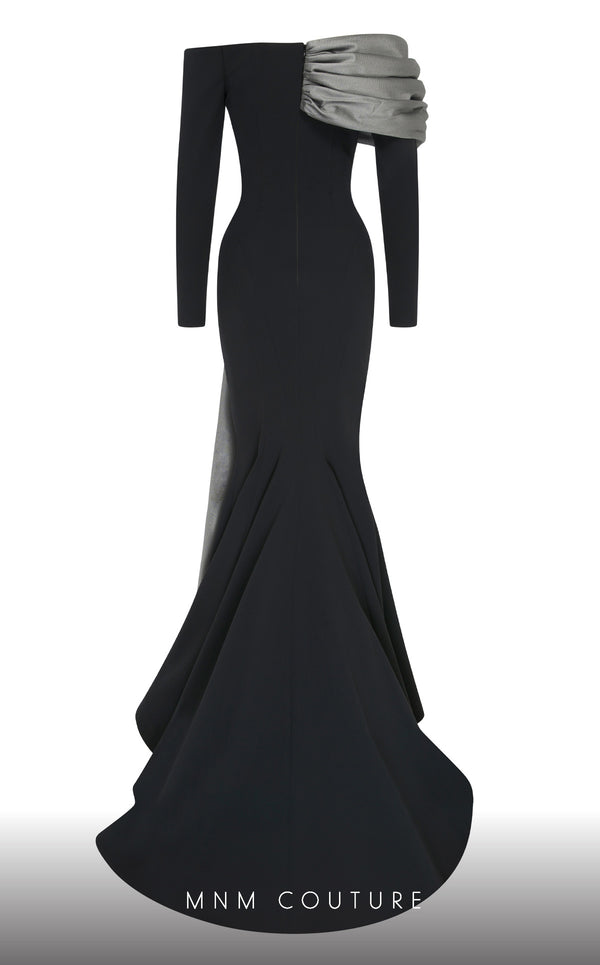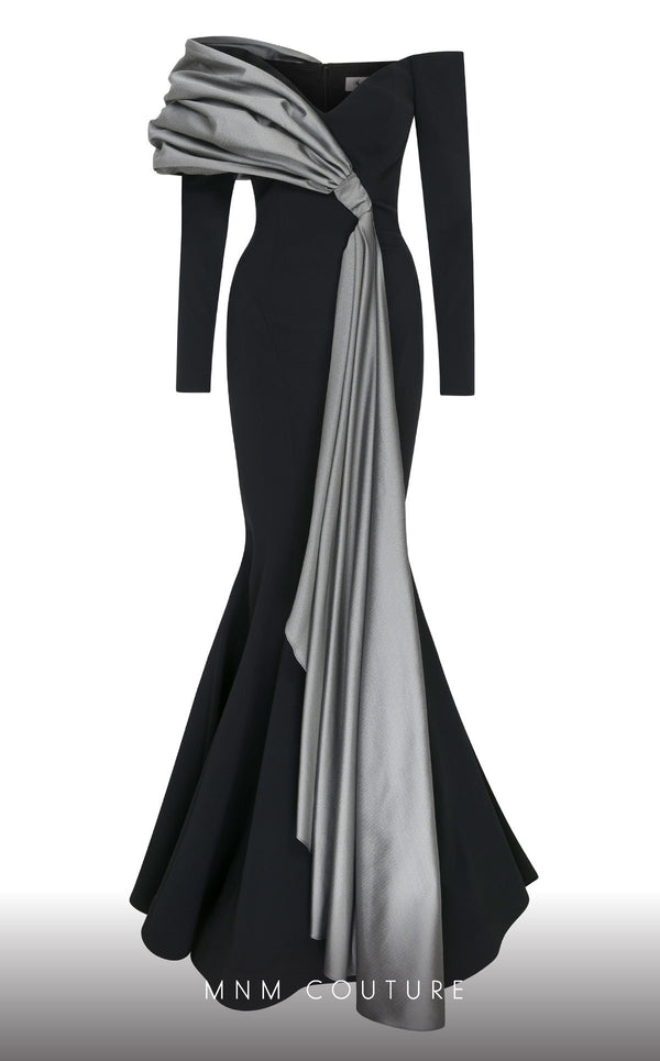 Embrace luxury with the MNM Couture N0561 from Couture Shop LA. This two colors Brocade gown features off-shoulder long sleeves and a strapless V-neckline. The mermaid silhouette with a knot and draped bust detail offers a strikingly elegant look.