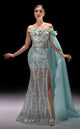 MNM Couture K4241 makes a bold statement with its beige asymmetric design. This fitted gown features a corset-style bodice, elegant cape detail extending to the mid-back, and intricate bead and pearl embroidery for a luxe finish.