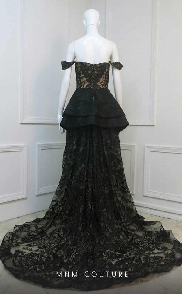 Be fierce in this gorgeous sweetheart-necklined dress with off-shoulder sleeves. This double-layered formal dress is sheer with gorgeous accents of color in the maginificent lace embroidery. This dress is sure to stand out. With a back peplum and a full A-line skirt, this designer dress is one fit for a queen who reigns supreme.