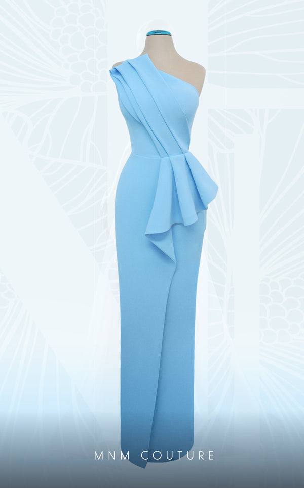 Bold and vibrant, the MNM Couture N0425 redefines modern glamour. This fuchsia and indigo column gown showcases striking asymmetric pleats cascading across the bust and one shoulder. A peplum detail at the waist highlights the silhouette, while the clean lines and bold colors make it perfect for high-impact evening wear.