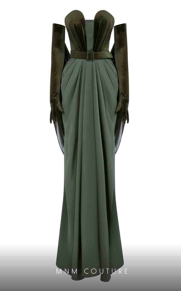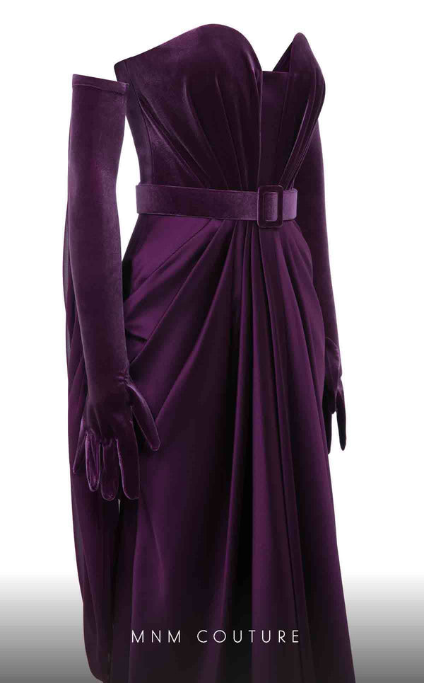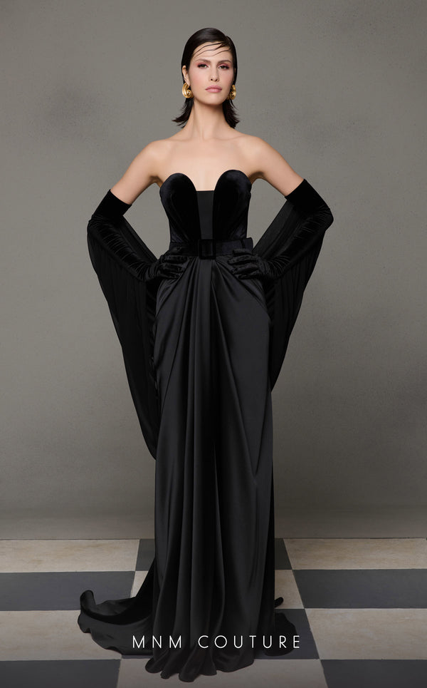 MNM Couture N0634 elevates dramatic couture. This sleeveless velvet gown features a sweetheart neckline, flare silhouette, and a pleated waistline. Gloves and a cape amplify its regal charm, creating a statement of sophistication.