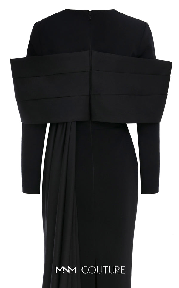 Define modern elegance with the MNM Couture N0672, a special occasion dress that artfully combines sleek structure with dramatic flair. This luxurious haute couture evening gown is crafted from light green rayon crepe, tailored into a sophisticated column silhouette. The unique long-sleeve halter neckline is enhanced by a twisted, pleated strap that crosses the bust, adding a touch of intricate detail.