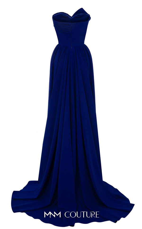 Experience modern sophistication with the MNM Couture N0687, a special occasion dress that redefines contemporary elegance. This luxurious haute couture evening gown is expertly crafted from high-quality rayon crepe, featuring a sleek, fitted column silhouette that exudes confidence. The design showcases an artistic asymmetric style, with a beautifully pleated section on one side and unique braided straps on the other, culminating in a sweetheart neckline. A thin fabric belt cinches the natural waistline, while a dramatic train-cut skirt, attached at the half-back, adds a final flourish of show-stopping glamour. This limited-quantity piece is a testament to innovative design, perfect for making an exclusive statement.