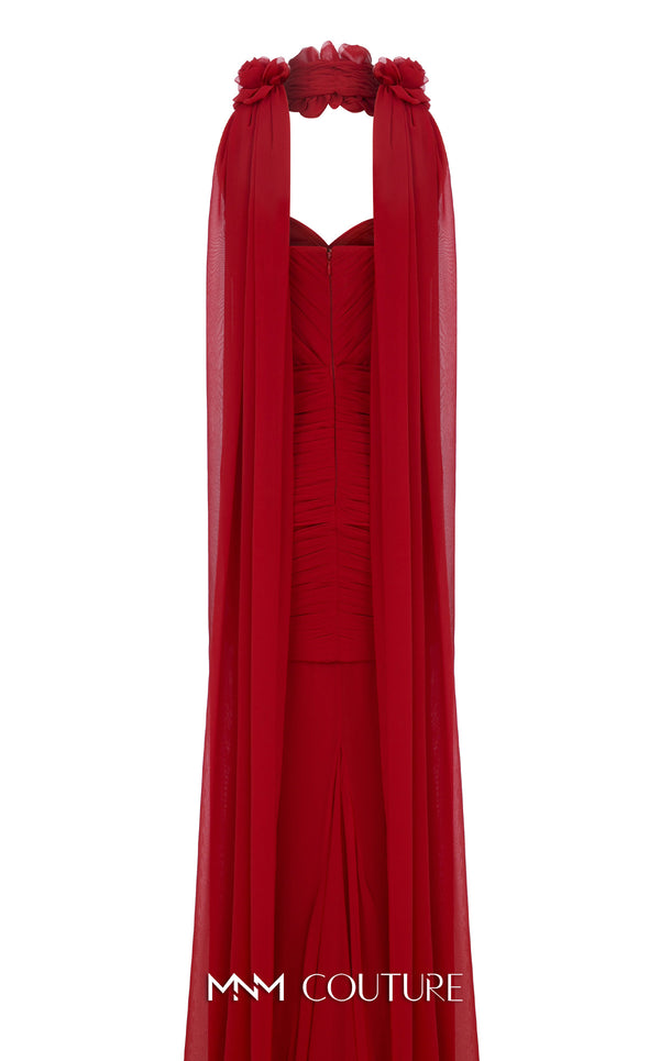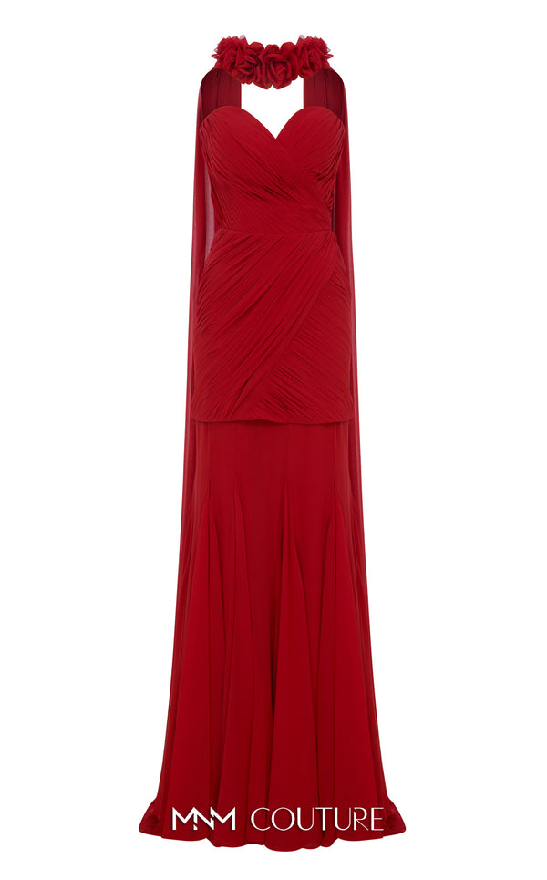 Combine drama and sophistication with MNM Couture Style N0655. This black fitted mini dress, crafted from organza, flares into a long, cascading organza skirt. The sweetheart neckline is enhanced by an intricate cape adorned with fabric flowers and a dramatic train. Ideal for bold entrance moments, this dress highlights your silhouette while exuding avant-garde allure.