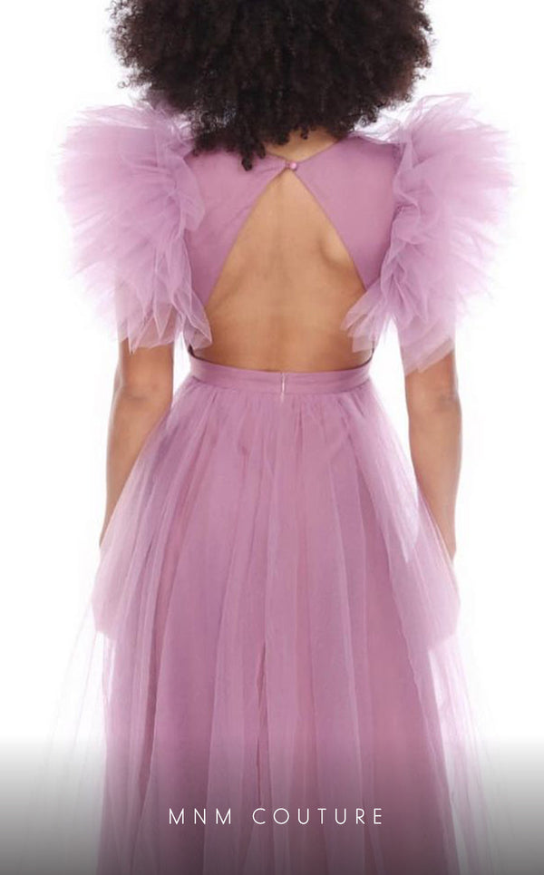 Enchant with opulence in the GLAM by MNM Couture R07469. This tulle gown features elegant puff short sleeves, a striking V-neckline, and a daring side slit that exudes sophistication. Designed with a natural waistline and flowing silhouette, it's the perfect statement for grand entrances at galas or red-carpet events.