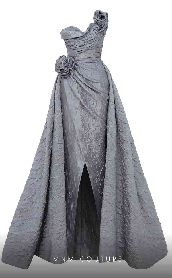 Embrace luxury with the MNM Couture F02877, a Brocade gown featuring an asymmetrical neckline and rosette detail. Its puff long sleeves and tulip skirt with a sweep train create a fashion-forward silhouette.