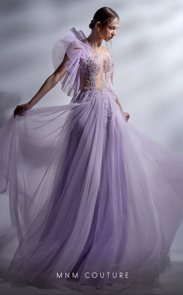 Channel your inner goddess in this ethereal couture look. A sheer top embellished with brilliant beaded appliques and one-shoulder plied tulle ruffle detail flow into the A-line slit skirt made from layers of lace and tulle fabric. You can’t go wrong with a style like this. Order now or visit us in-store today.