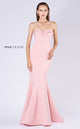 This classy couture gown has a sharp plunging neckline with a mesh lining. Decorative seams run in an hour-glass shape from beneath the shoulders, in to the waist, out towards the hips, and down the skirt. The whole dress is made of a lovely crepe fabric. The long trumpet skirt has a slight train, adding a little flare to this simple, elegant dress.
