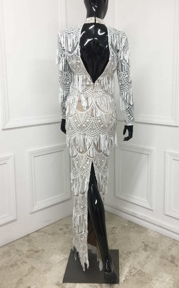 Become a fancy fashionista in this long, form-fitting evening gown. This long-sleeve mock neck dress features a solid-fabric underlay and a sequined exotic pattern with hanging sequin-fringe detail sheer overlay. It contains an open back with a sexy slit that zips up. Shop online today.