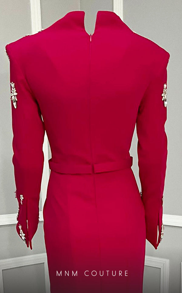Discover sophistication with the MNM Couture V02030, available at Couture Shop LA. This Rayon Crepe masterpiece showcases slashed long sleeves and a graceful V-neck, enhancing its column line silhouette. Embellished with rhinestones, crystals on shoulders pads, hands cuffs and on the refined belt along with unique button details from the V-neck till waist,. This gown effortlessly combines elegance and modernity, ideal for those seeking timeless evening wear.