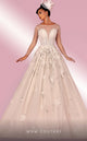 This everlasting princess dress will complete your special day. Beneath the layers of tulle and shiny tulle lays a gorgeous sweetheart-style corset top. Lace appliques and beading have been meticulously placed throughout the gown, creating a dreamy, romantic look. Available at our downtown LA location today.