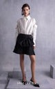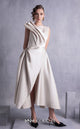 MNM Couture GOS2518 combines a short off-white taffeta skirt with intricate draping and a sweeping train with a sophisticated off-shoulder piqué corset top. The corset’s structured fit and minimal design exude elegance, while the skirt’s dramatic silhouette adds a touch of haute couture. This exclusive look is perfect for red-carpet events or glamorous evenings.