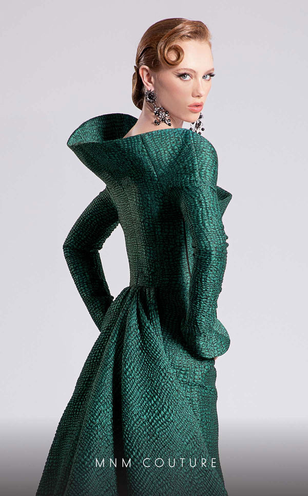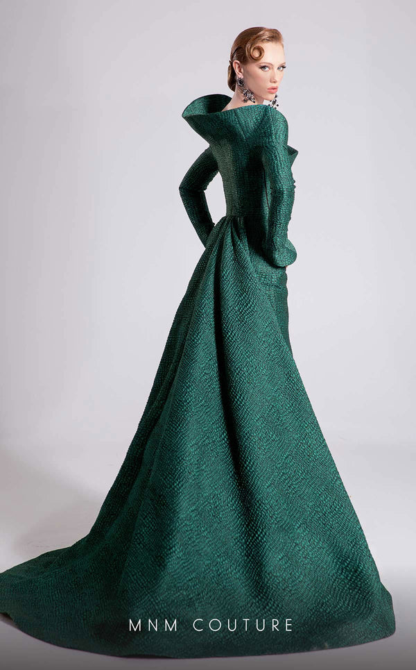 Step into a world of refined luxury with MNM Couture Style F02910, an exquisite jacquard fitted dress designed to make a statement. The dress features a unique asymmetrical off-shoulder neckline paired with elegant long sleeves, exuding modern sophistication. Its fitted silhouette is complemented by an undetachable back skirt with a dramatic long train, offering grandeur and elegance for any special occasion. Completed with a scoop backline, this gown is a masterpiece of haute couture craftsmanship.