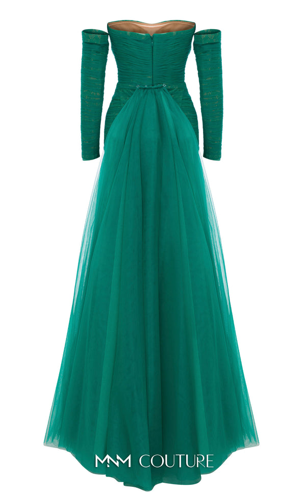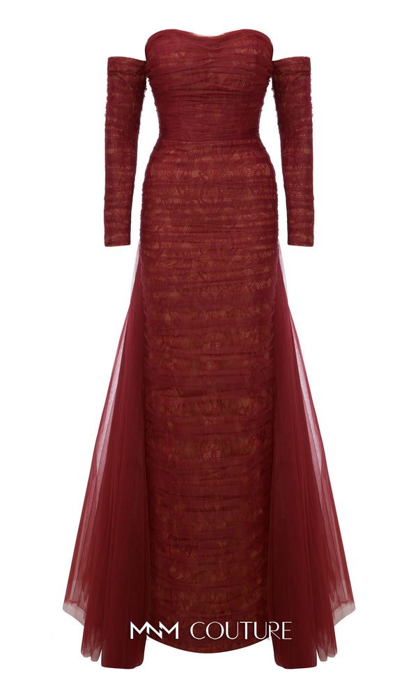 Exude sophistication with MNM Couture Style N0656, an exquisite black column gown crafted from delicate lace and luxurious organza. This stunning piece features a semi-sweetheart neckline that perfectly frames the décolletage. The fitted silhouette flows seamlessly into a dramatic undetachable back skirt with a train cut, made from opulent organza. Accented with elegant gloves, this gown is a show-stopper ideal for haute couture special occasions.