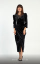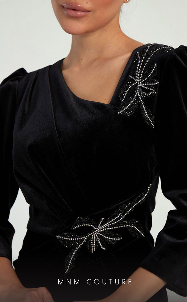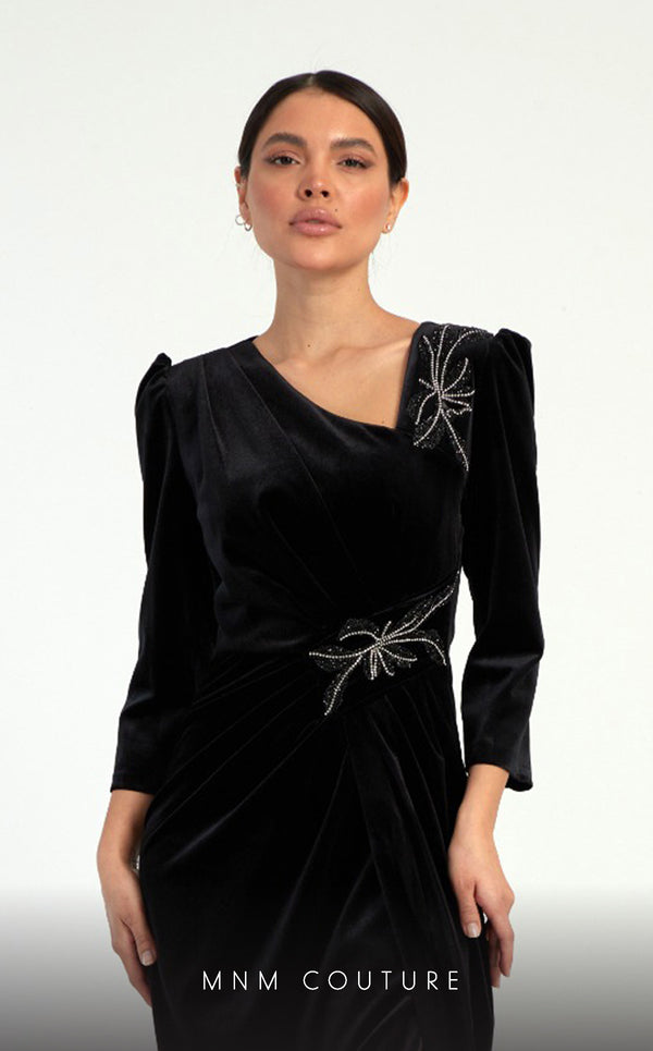 GLAM by MNM Couture DZ1079 makes a bold statement with a unique diagonal neckline and long sleeves. Designed in 100% polyester, this midi dress flatters the natural waistline, creating a striking silhouette perfect for upscale soir�es or professional engagements.