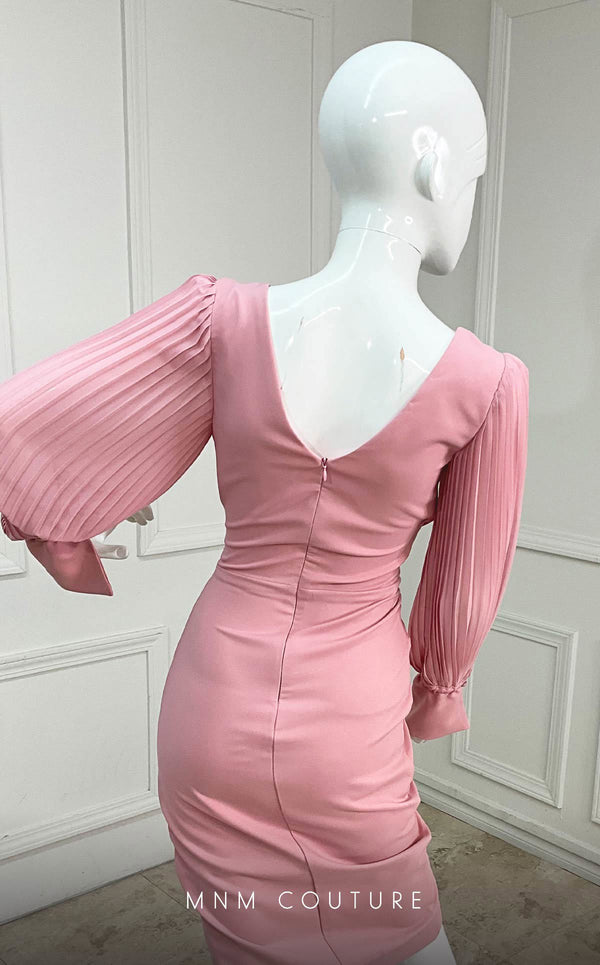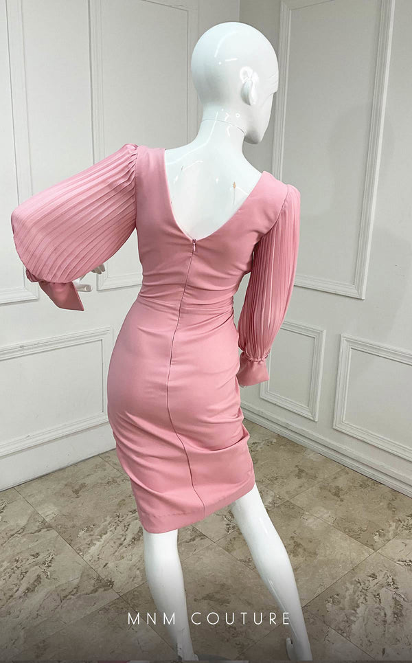 Elegance meets refinement in GLAM by MNM Couture R01104. This stunning midi dress features long pleated sleeves and a flattering V-neckline. Crafted from a premium polyester-spandex blend, its draping design enhances the natural waist, making it ideal for cocktail parties or formal events where sophistication is paramount.