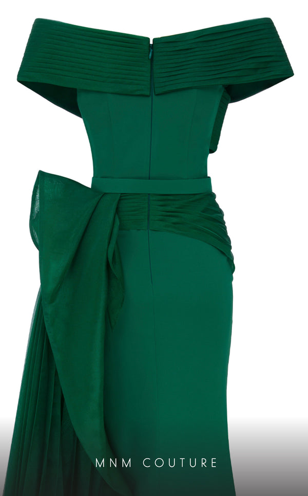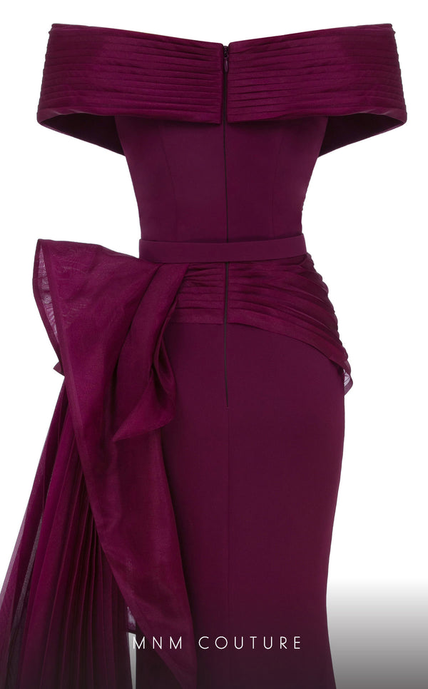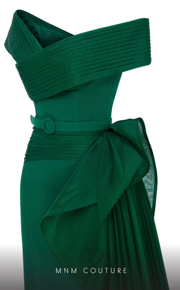 Elevate your look with the MNM Couture 2692, an exquisite mermaid gown crafted from chiffon and crepe. This design features a pleated foldover neckline and a cinched belt that beautifully accentuates the waist. Ruffled side peplums give texture and flair, while the cascading sash detail adds movement and charm. The sweep train completes the gown, making it a perfect pick for weddings, formal soir�es, or red carpet events.