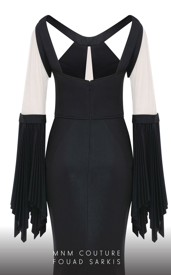 Embrace the allure of the MNM Couture 2751, a Crepe lameh gown with a Mermaid silhouette. This dress features illusion and ruffled sleeves, long draped bust details, and is perfect for those seeking a blend of modern elegance and timeless style.