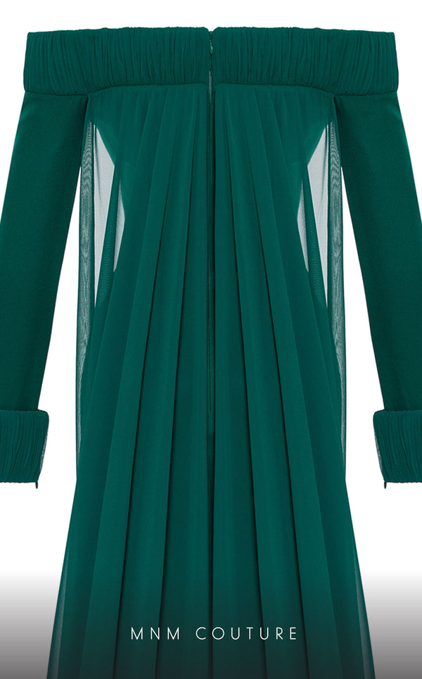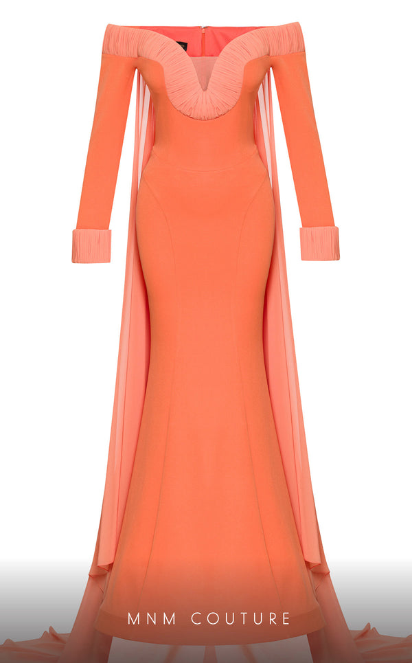 Embrace the allure of the MNM Couture 2793, a Crepe with shifon gown featuring an off-shouldered cut and mermaid lower body. With two tails and long sleeves, this dress is beautifully embellished with drapes on the bust.