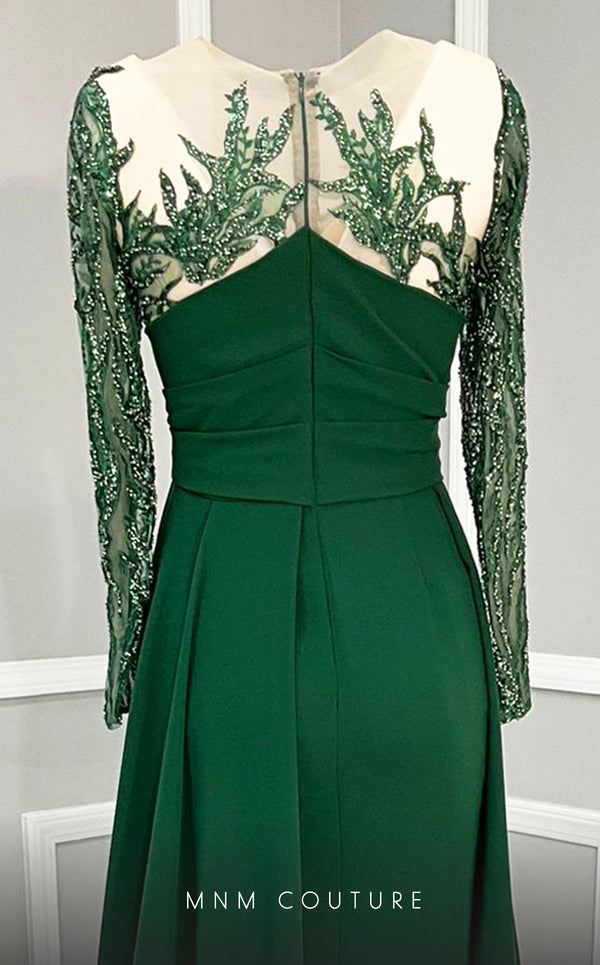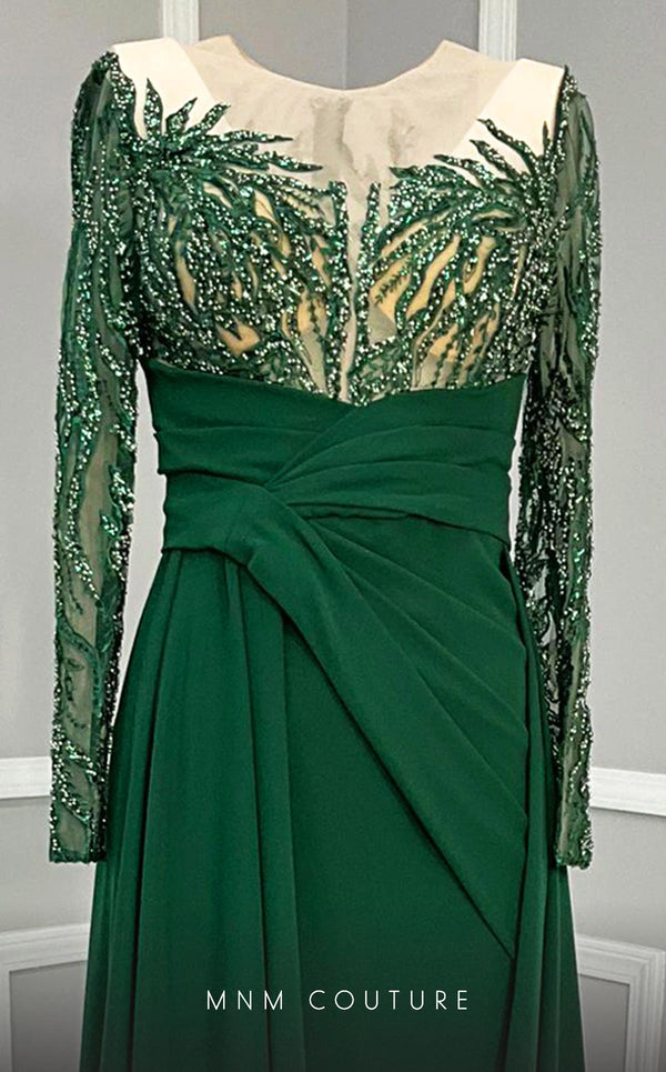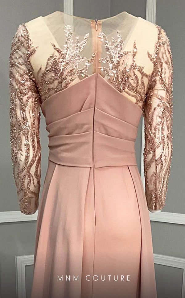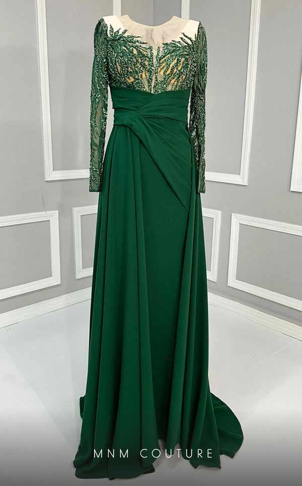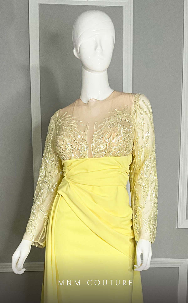 Make a statement in the MNM Couture K3893 from Couture Shop LA. This stunning rayon crepe and mesh dress features a back hidden zipper and showcases a natural mermaid silhouette with a long train cut. The illusion neckline and long mesh sleeves bring a touch of elegance, while the sequins and embroidery on the bodice and sleeves add a dazzling finish. Complete with pleats at the waistline and a flowing cape on both sides, this dress is perfect for any glamorous occasion.
