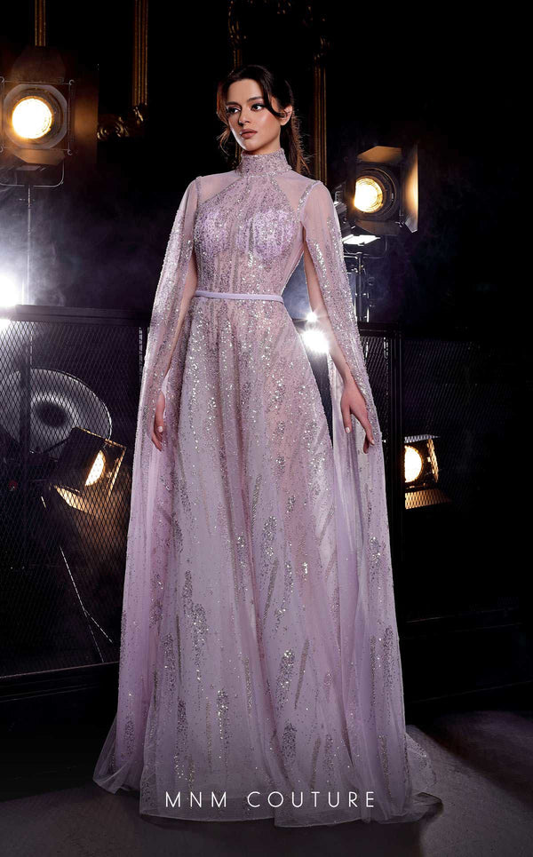 Exude grandeur with the MNM Couture K3975, a silver and purple A-line gown that redefines elegance. This gown features luxurious cape sleeves, a high neckline, and translucent shoulders. Intricate embroidery with sequins and beads adds a dazzling touch, complemented by a fabric belt.