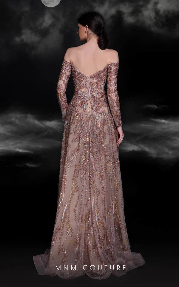 Discover glamour with the MNM Couture K4121 from Couture Shop LA. This exquisite off-shoulder mesh dress features a back hidden zipper, long sleeves, and a sweetheart neckline. It has a natural fit with a straight cut, complemented by an attached skirt at the back. The dress is fully embroidered with shimmering sequins, making it a stunning choice for any event.