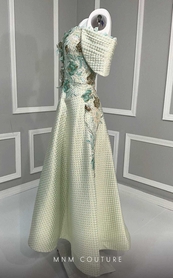 Embrace sophistication in the MNM Couture K4217 from Couture Shop LA. This charming tea-length dress features a back hidden zipper, cap sleeves, and a straight across neckline. The dress is beautifully embellished with embroidery on the bust, adorned with sequins and beads in various shapes, along with fabric flowers that resemble a stunning bouquet. Perfect for any special event, this dress combines elegance and style.