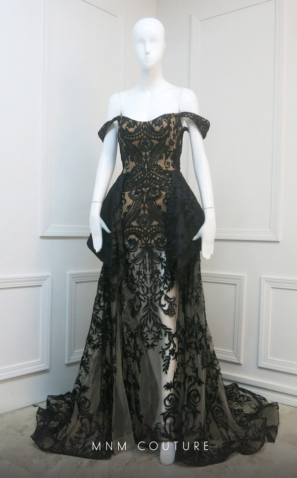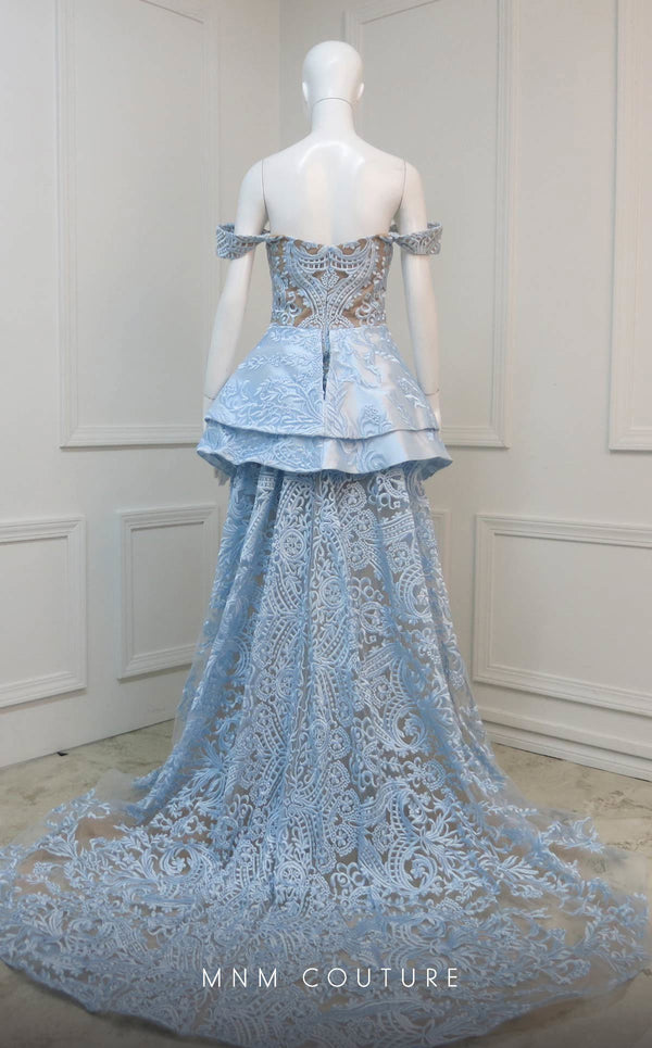 Be fierce in this gorgeous sweetheart-necklined dress with off-shoulder sleeves. This double-layered formal dress is sheer with gorgeous accents of color in the maginificent lace embroidery. This dress is sure to stand out. With a back peplum and a full A-line skirt, this designer dress is one fit for a queen who reigns supreme.