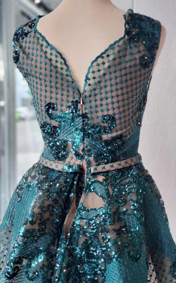 MNM Couture N0272 mesmerizes with its sleeveless sequined design and nude lining. A beaded band accents the notched bodice, leading to a scalloped high slit and a dramatic overskirt with a sweep train.
